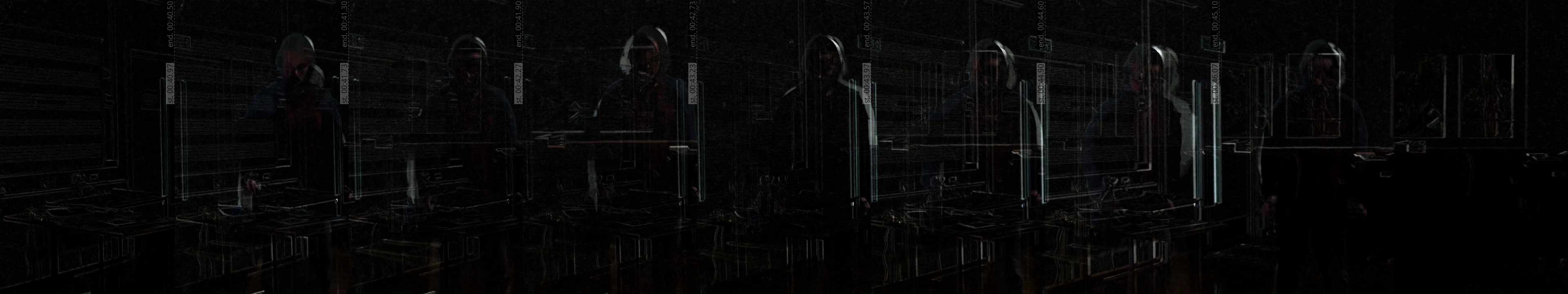 Analysis of segment of video from performance. Extracts are determined by the relative movements of the right and left knees to each other, with images taken at the points where the knees are closest and furthest from each other. Each image pair is illuminated according the level of change in the image. The composite images are cascaded, with the recorded video times displayed along side it.